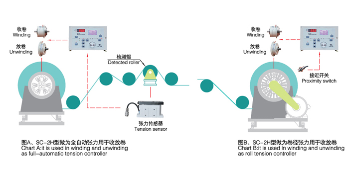 SC-2H型自動張力控制儀可以設(shè)置卷徑張力控制儀,只需安裝接近開關(guān)或編碼器對卷料半徑進(jìn)行測量,控制儀根據(jù)卷徑進(jìn)行張力控制。