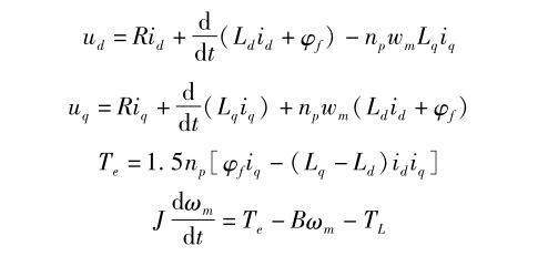 式中 , R 為定子繞組電阻 ; i d 、 i q 為 dq 軸定子電流 ; L d 、 L q 為 dq 軸定子電感 ; 為轉(zhuǎn)子上的永磁體產(chǎn)生的磁鏈 ; ω m 為轉(zhuǎn)子角速度 ; n p 為極對(duì)數(shù) ; B 為電機(jī)黏滯摩擦系數(shù) ; J 為電機(jī)轉(zhuǎn)動(dòng)慣量 ; T L 為負(fù)載轉(zhuǎn)矩 。
